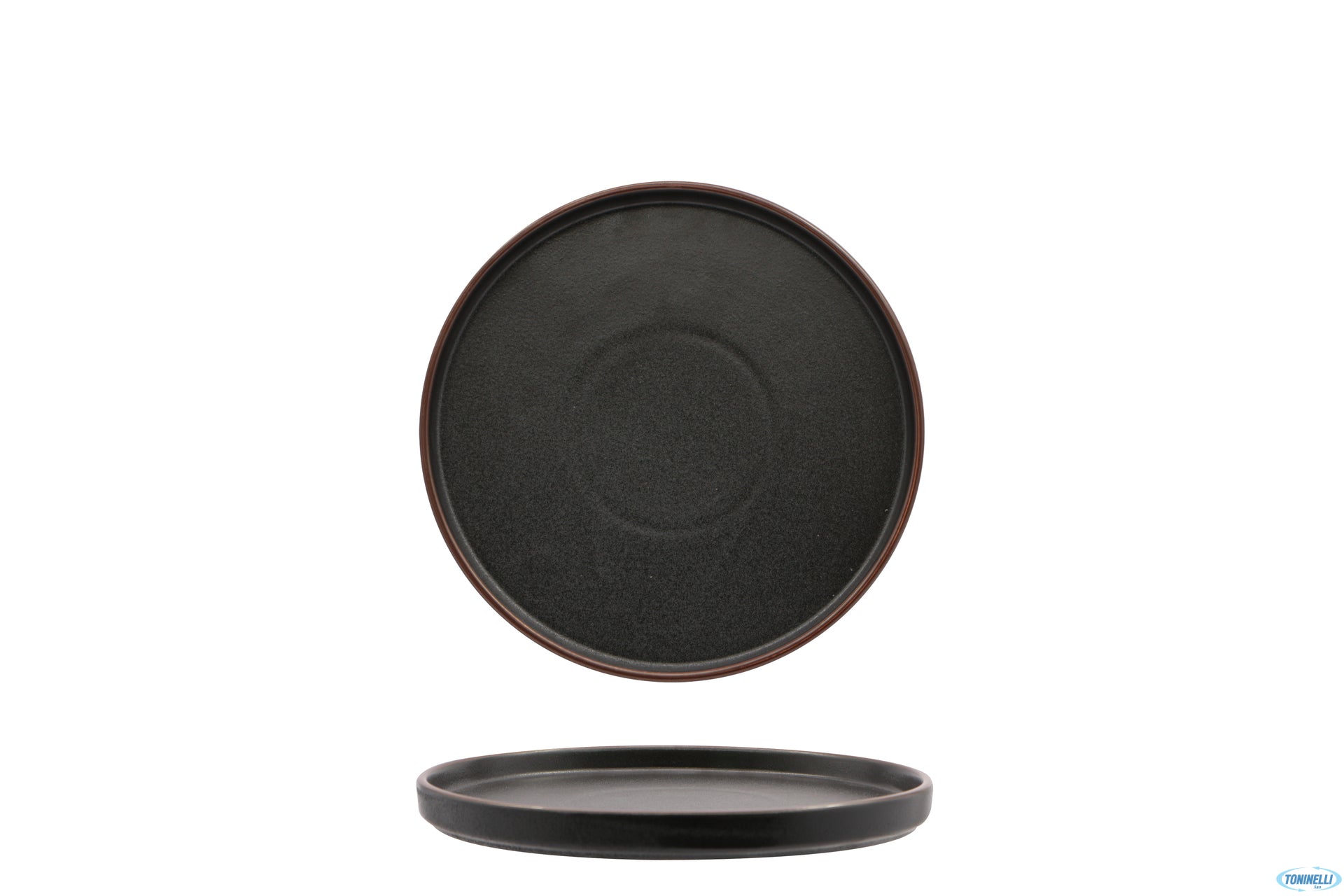 piatti ed accessori in stoneware nero, con un elegante bordatura ramata che dona eleganza ad una linea che si ispira alla terra ed ai colori delle isole vulcaniche